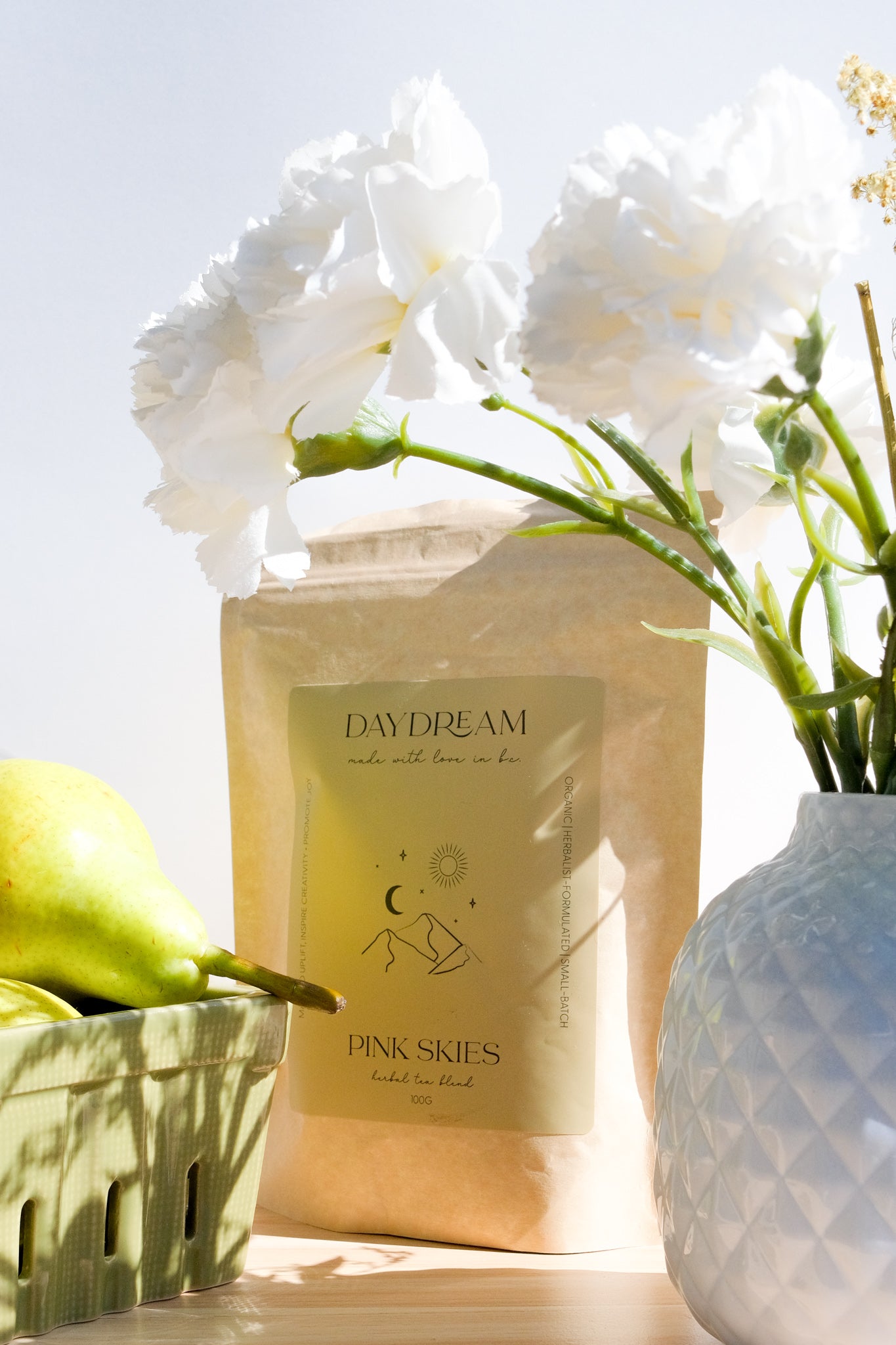 Add 1-2 tablespoons of our Pink Skies herbal tea blend to hot water and allow to steep, covered, for approximately 10 minutes. Enjoy on its own, or with lemon, honey or additional ingredients of your choosing.